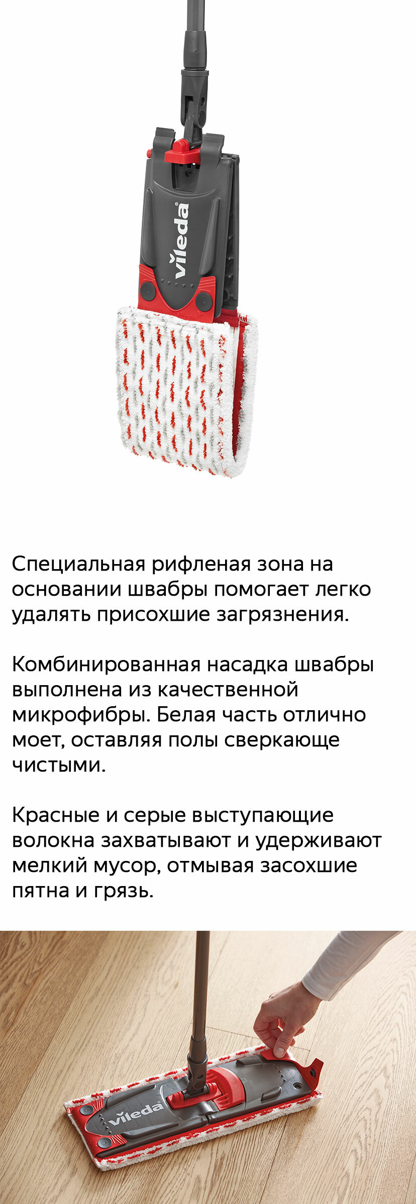 При работе с насадкой на швабре моп удерживайте ровную позицию, чтобы добиться максимальной площади уборки.