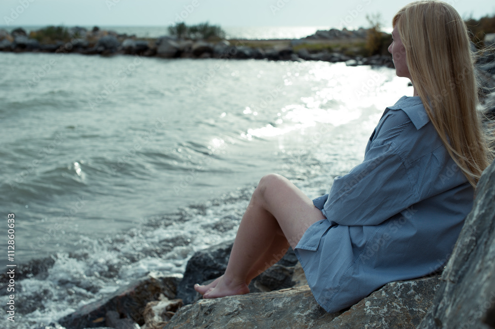 Одинокая девушка смотрит на вечернее море
