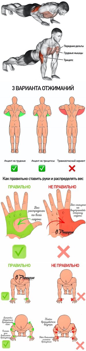 Отжимания - одно из самых простых и эффективных упражнений на грудные мышцы. Выполняйте отжимания на полу с собственным весом, контролируя глубину сгибания рук. Варьируйте уровень нагрузки, изменяя ширину расположения рук: узкий хват акцентирует нагрузку на верхнюю часть груди, а широкий - на середину и нижнюю часть.