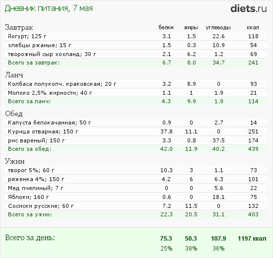 Рацион 2200 ккал/день для снижения веса (мужчины)