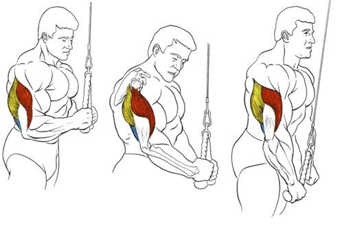 Разгибания в блоке с канатом. Качаем длинную головку трицепса