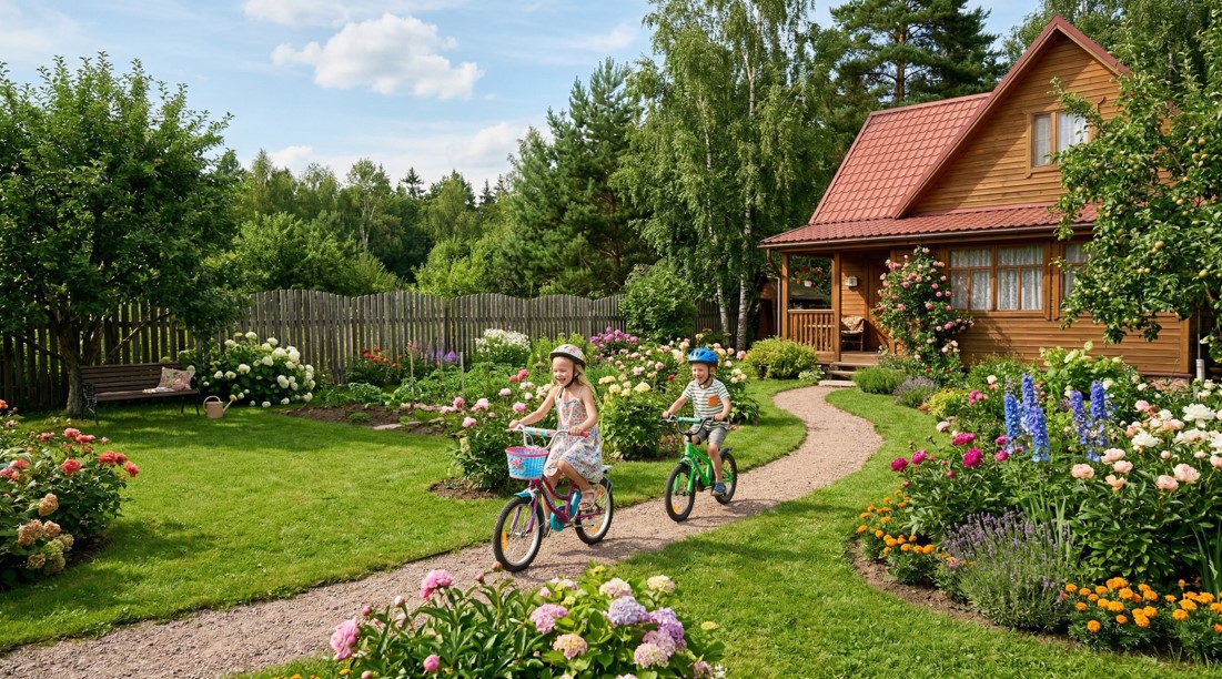 В этой статье собраны проверенные идеи для организации детского досуга на дачном участке — от обустройства велодорожки и спортивного уголка до творческих занятий на открытом воздухе. Подойдёт для детей от трёх лет и старше.